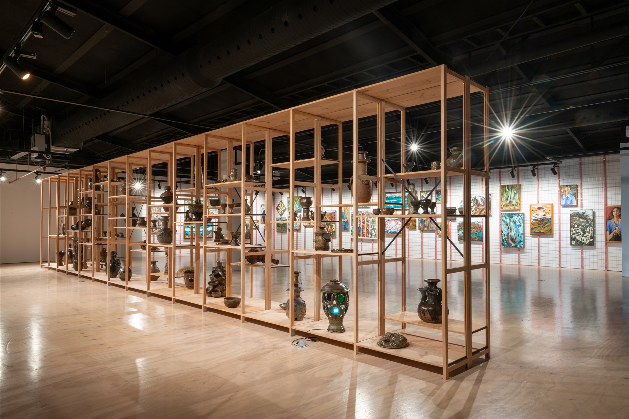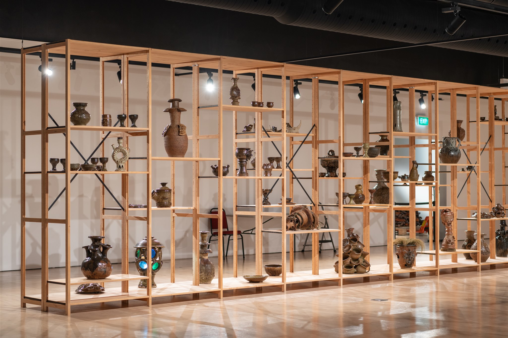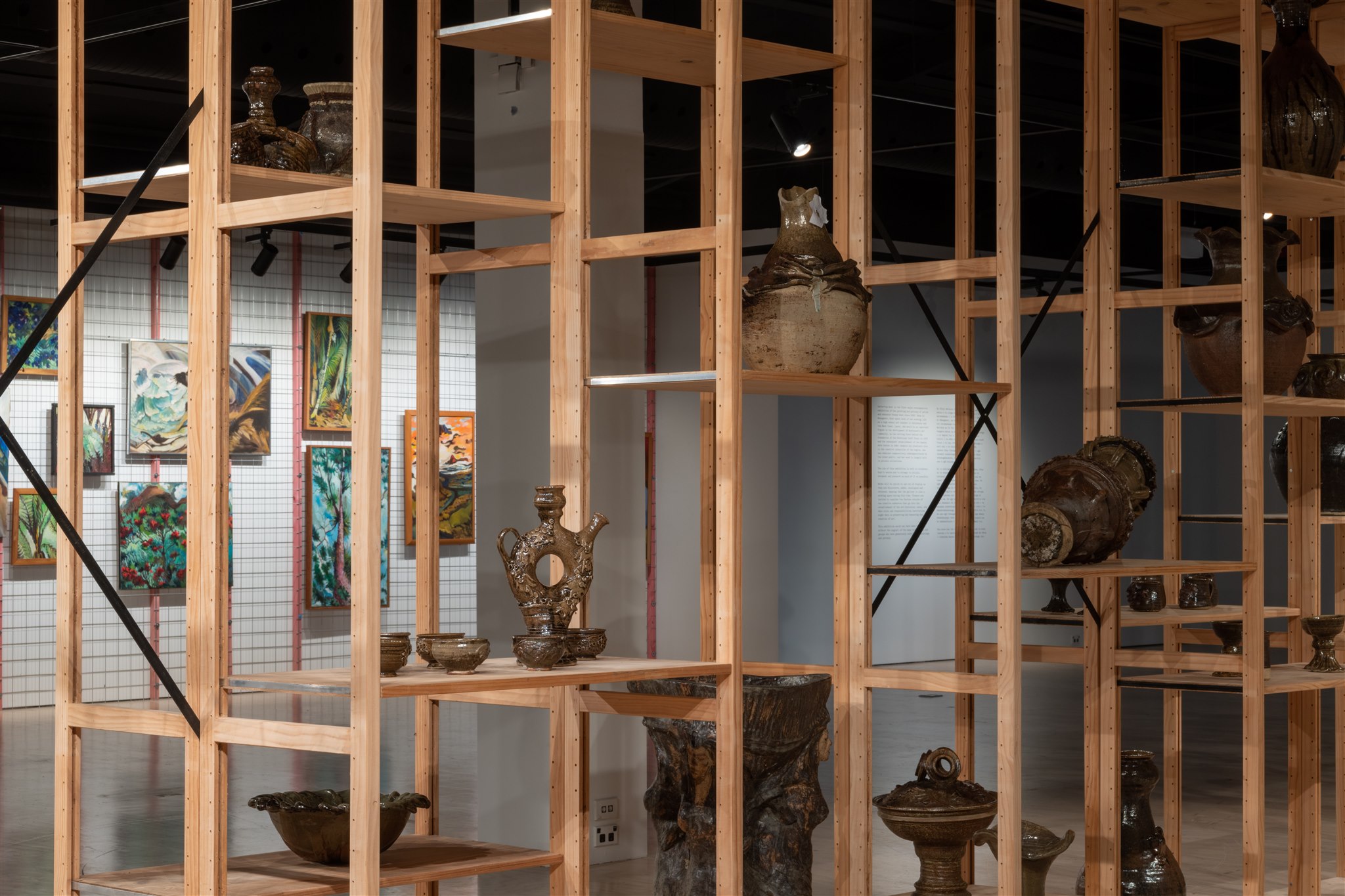 Gathering Rust has been designed to acknowledge this dual function. Ceramics are placed on easily accessible wooden shelving, while paintings are hung on steel mesh racking normally used for storage rather than display. Viewers are invited to consider the factors outside of raw creative endeavour that go into the establishment of the art historical canon, and what roles and responsibilities institutions might have in preserving and honouring the creation of art.